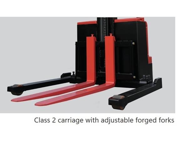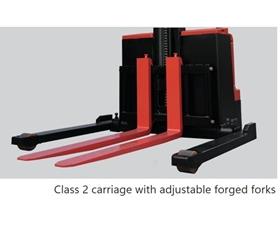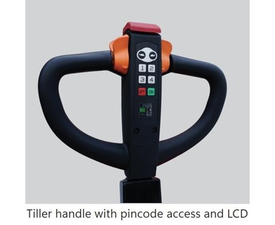 Curtis controller that features 24V AC with CAN Bus electrical system. Forged, 4"W x 42"L, forks painted safety orange (straddle models only). Class 2 carriage with multiple locking positions. Newly designed tiller handle with keypad, turtle speed, horn and battery discharge indicator. Polyurethane, non-marking load wheels. Power-on function. FOB Shipping Point.