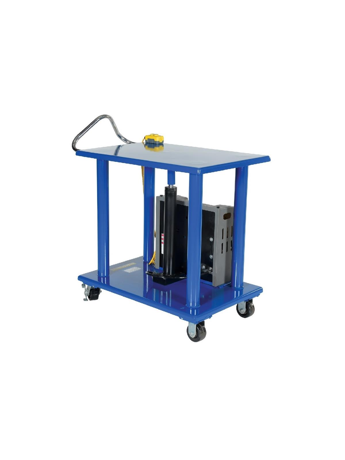 Hydraulic center post lifts tabletop with rigidity. Models with corner posts are telescoping to help stabilize and fully support the load during operation. Rolls smoothly on durable heavy duty casters. FOB Shipping Point.