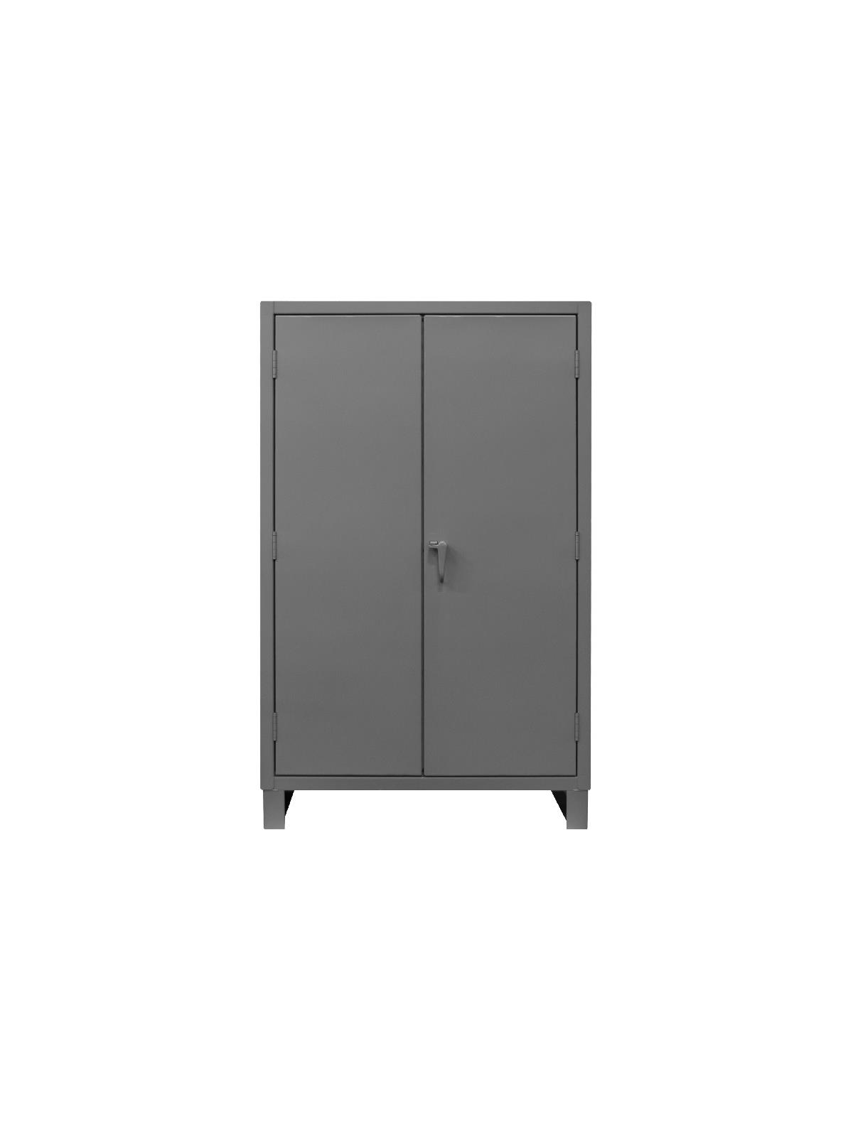 Feature rugged, all-welded 12 ga. steel construction and handsome flush door design. 4 reinforced steel shelves are adjustable on 2-1/2” centers. Includes extra heavy-duty hinge pins that secure doors to avoid sagging. Sturdy 3-point, cast steel locking handles have 3/8” dia. rods and provision for padlock (padlock not furnished).  6" high box style legs offer space for lift truck forks and can be lagged to the floor, constructed of 3/16" steel. Durable Gray powder coat finish. FOB Shipping Point.