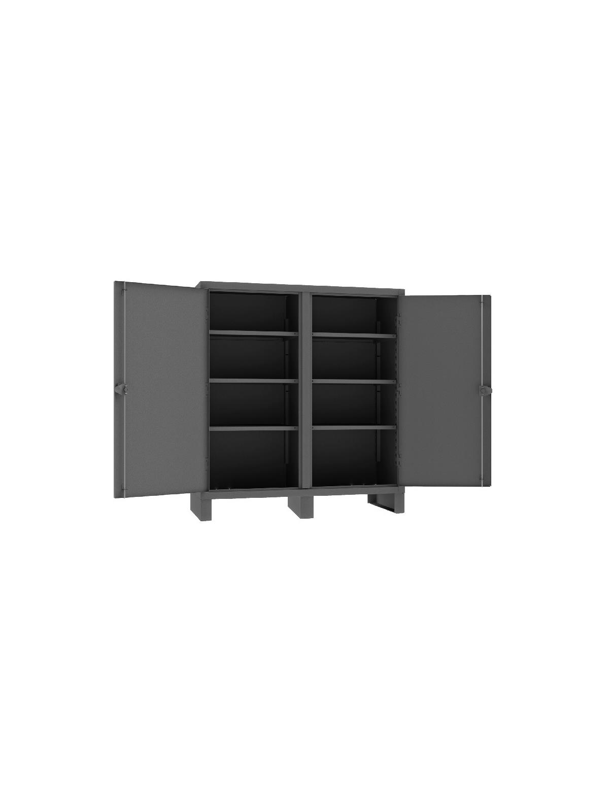 Feature rugged, all-welded 12 ga. steel construction and handsome flush door design. 4 reinforced steel shelves are adjustable on 2-1/2” centers. Includes extra heavy-duty hinge pins that secure doors to avoid sagging. Sturdy 3-point, cast steel locking handles have 3/8” dia. rods and provision for padlock (padlock not furnished).  6" high box style legs offer space for lift truck forks and can be lagged to the floor, constructed of 3/16" steel. Durable Gray powder coat finish. FOB Shipping Point.