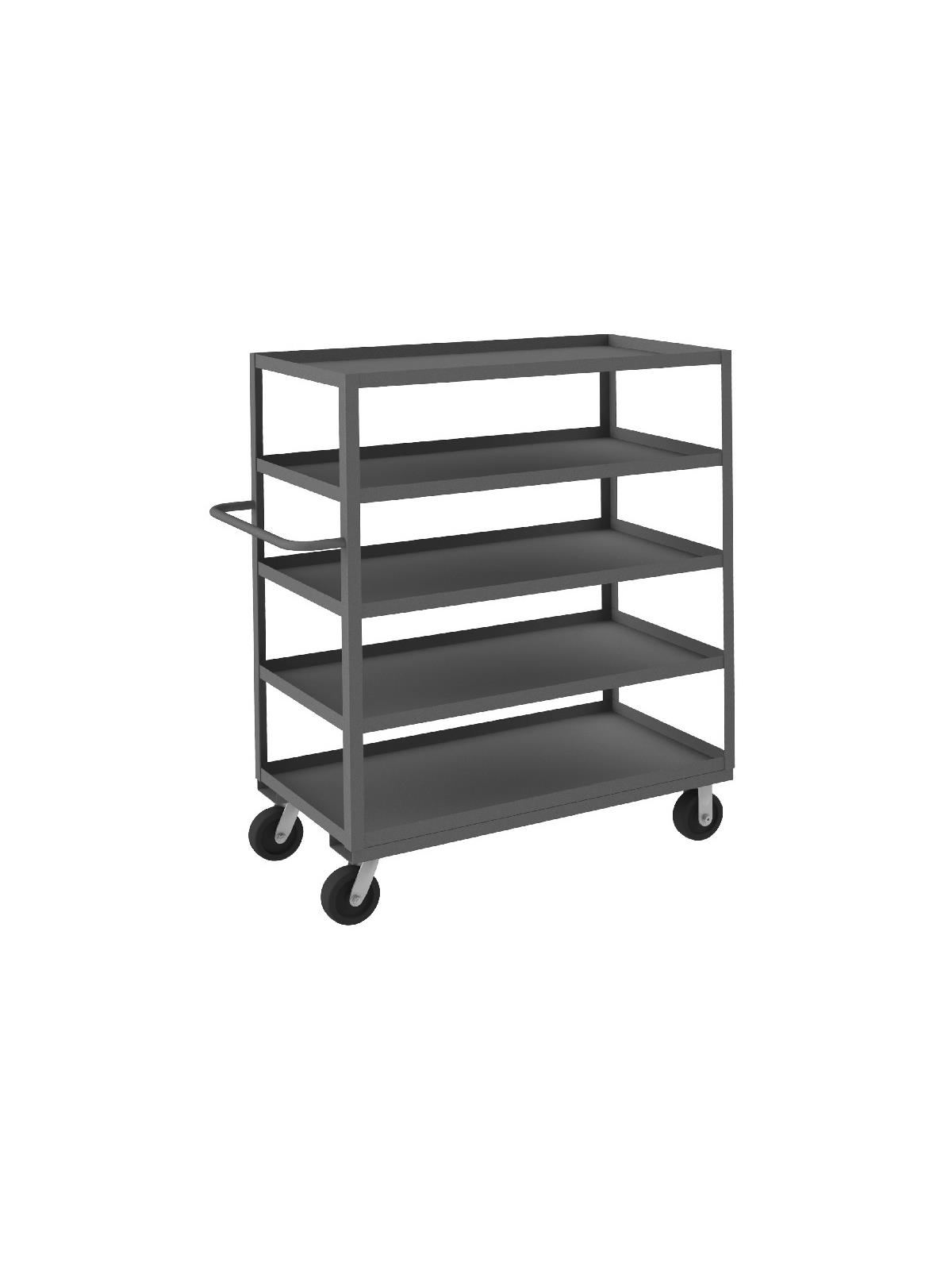 Shelf carts are constructed with 1-1/2" x 1/8" angle iron uprights for added strength. Heavy duty 14 gauge steel shelves. Sturdy tubular push handle. Perfect for transporting heavier parts or stock items. Shelf Stock Carts are available in 1,200 lbs. or 3,000 lbs. capacities. FOB Shipping Point.
