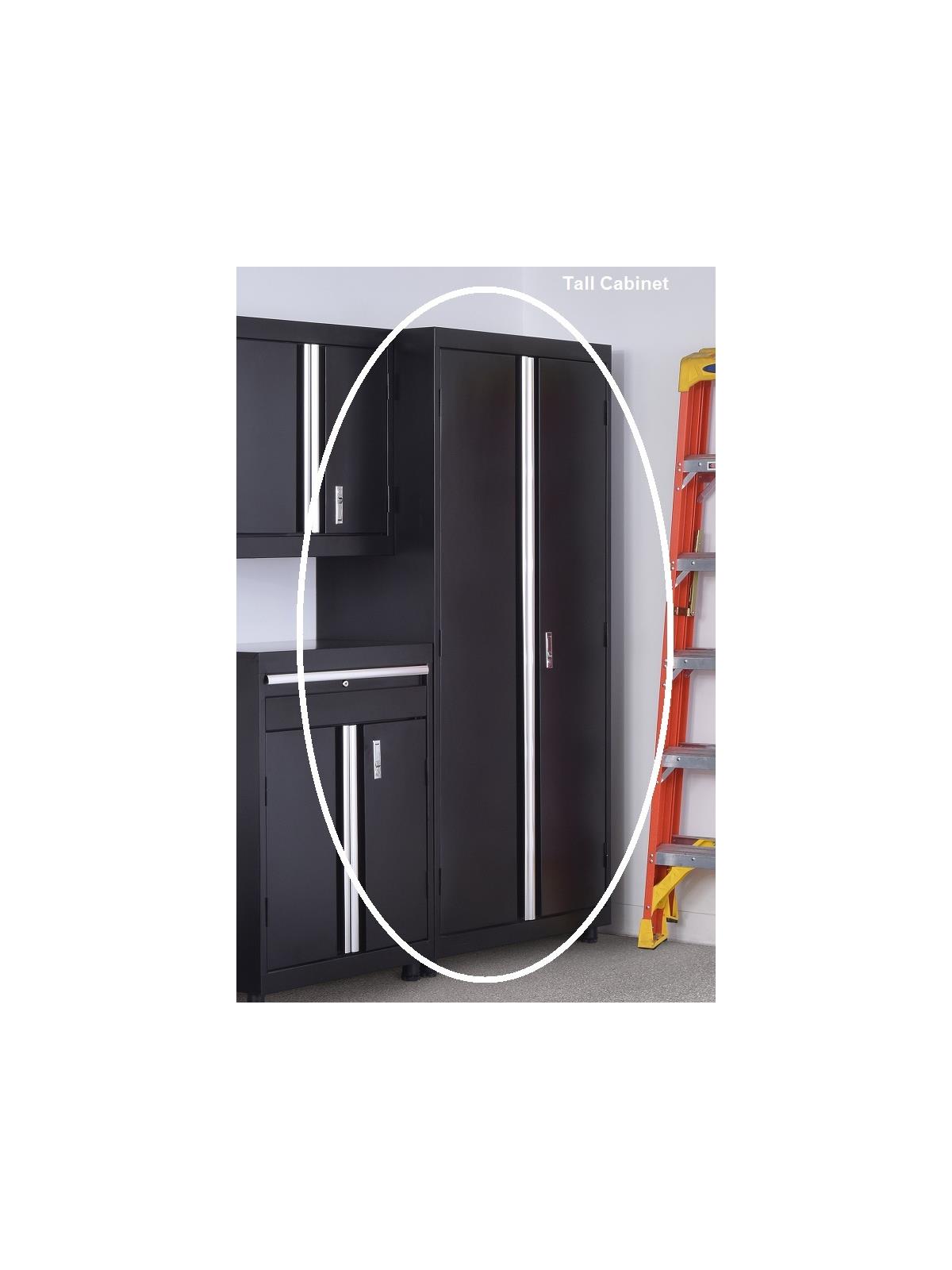 Durable all welded steel construction with durable black finish for lasting protection and beauty. Doors have full-length door pulls and a push button lock to keep cabinet secure. Heavy duty rounded legs with leveling guides to keep cabinets evenly leveled. Shelves adjust on 2" centers to accommodate various size items. 200 lb. capacity shelves; wall cabinet has 150 lb. capacity shelves. Cut-out access holes in back of cabinets allow cords through for charging. Drawer fully extends on ball-bearing slides. FOB Shipping Point. Steel surcharges may apply.