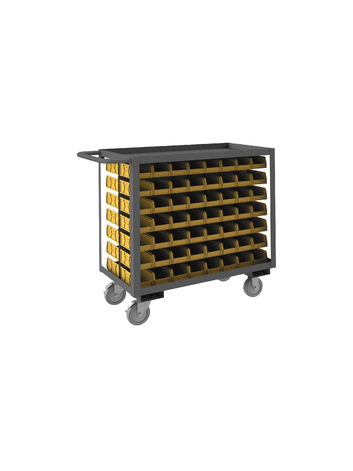 Carts feature 1-1/2" x 1/8" angle iron uprights for added strength. Shelves are heavy duty 14 gauge steel. Sturdy tubular push handle for ease of handling. Durable yellow Hook-On-Bins®. Top surface has 1-1/2" lips up. Louvered center panels accommodate Hook-On-Bins®. Rolls easily on 5" x 1-1/4" polyurethane bolt-on casters, (2) swivel with side brakes and (2) rigid. Ships fully assembled ready to use. Durable, gray, textured powder coat finish. FOB Shipping Point.
