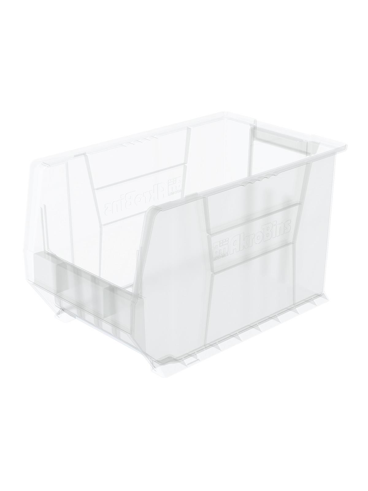 20", 24" and 30" Deep Clear Bins for Super-Size Storage. Large capacity storage bins for organizing heavy or bulky items. Heavy-duty bins molded in clear polypropylene. Extra large stacking containers feature anti-slide stop to prevent bins from shifting forward. Reinforced side ribs add strength and prevent spreading when stacked or loaded. Optional lids and dividers available. FOB Shipping Point. Surcharge may apply.