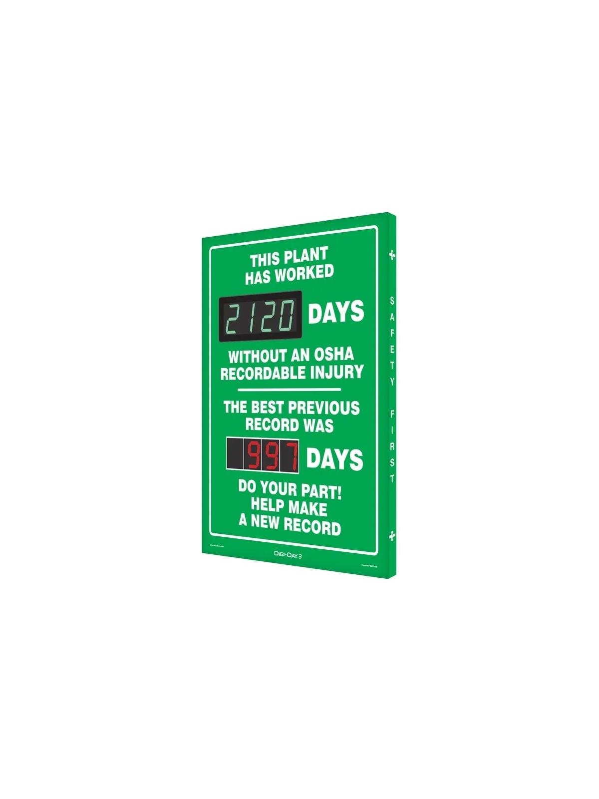 Electronic LED display advances automatically each day, eliminates the hassle of manually updating the safe day numbers. Safety Scoreboard with bright, digital display provides an eye-catching way to inform and alert employees, contractors, and visitors on tracking of safe work days in the workplace, as it counts up. FOB Shipping Point.