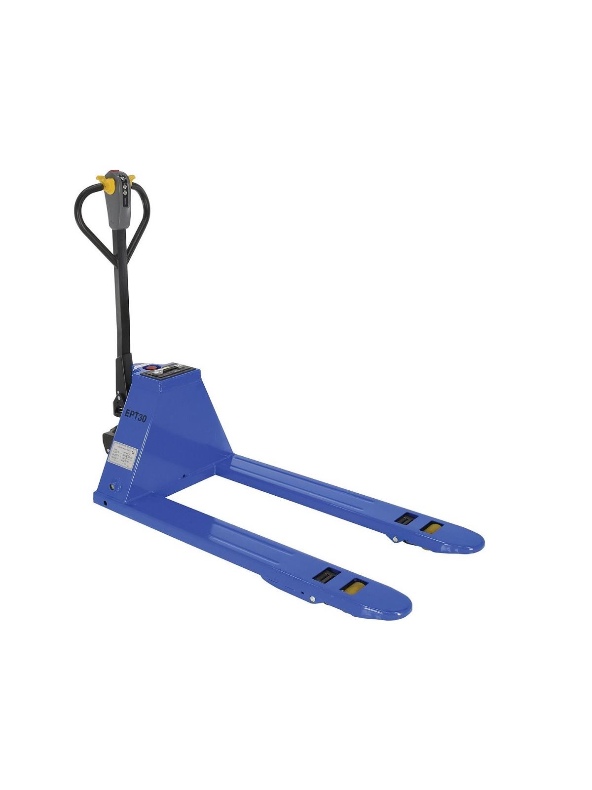 Compact body design and light service weight makes it suitable to use in tight areas and low-duty applications. Multi-function ergonomic handle with emergency reverse, battery indicator, raise/lower buttons, horn, and forward/reverse butterfly switch. Handle returns to vertical position automatically when released. Unit can be operated when handle is in up position (up-right driving). Equipped with maintenance free 24V/20Ah lithium ion battery. Battery is interchangeable for continuous usage. FOB Shipping Point.