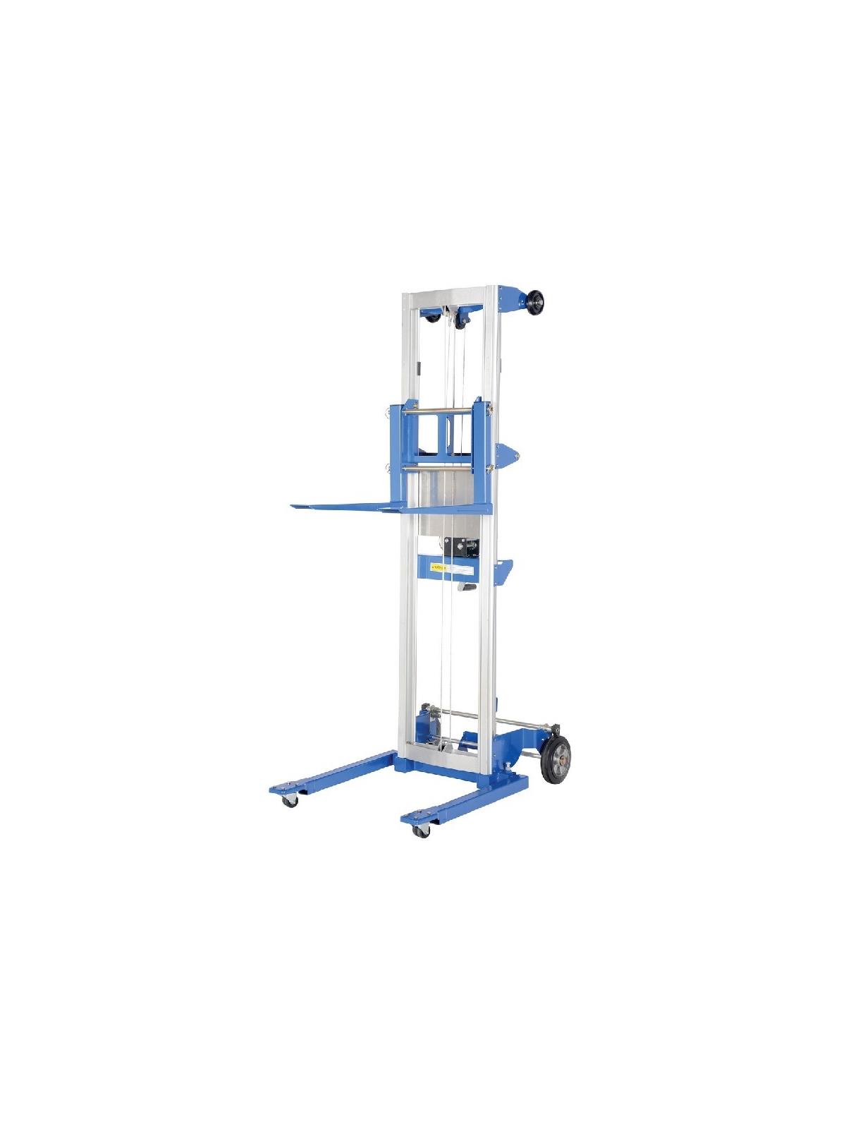 Operated by a hand-crank winch that features a reversible handle and a hold-down device for securing the carriage during transport. Forks can be inverted to provide 2 different heights. Rugged thick steel forks are 4"W x 1-3/4" thick and forks measure 20-1/2"W x 22"L overall. Truck is made of durable steel-and-aluminum. Two 8" non-marking rear wheels, two 2" front swivel casters. Counter balanced design has poly-on-poly wheels, (2) 5" rear swivel wheels, (2) 4" front wheels. Models ending with 'HP' and 'EHP' suffixes have extended height capabilities. These units have a 2 stage mast system and a telescoping inner mast frame, giving the user the ability to extend the forks above the height of the first mast. FOB Shipping Point.