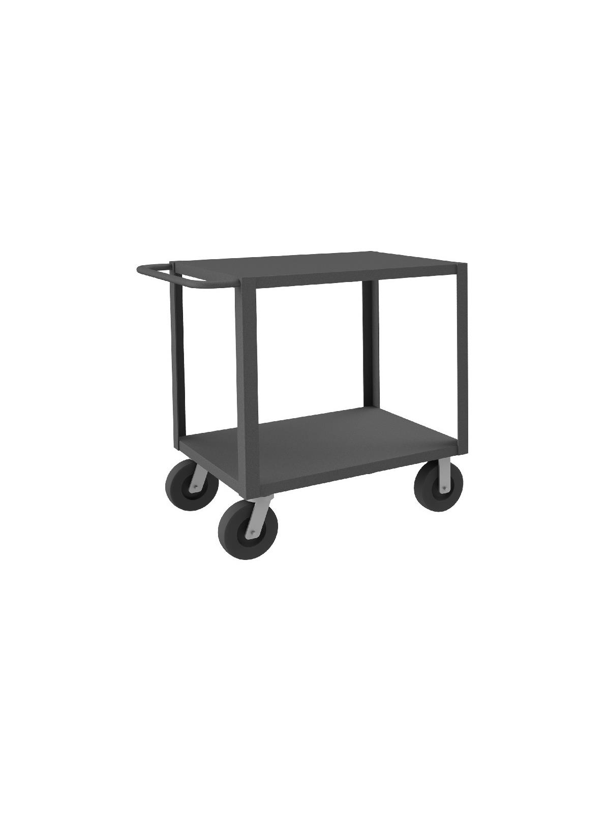 Heavy Duty Portable Tables have a 2" x 3/16" angle iron frame for added strength. Shelves are reinforced and have lips down. (2) swivel and (2) rigid bolt-on casters. Sturdy tubular push handle for easy maneuverability. 4,000 lbs. capacity unit has welded 14 gauge steel shelves with channel formed sides. 5,000 lbs. capacity unit has welded 12 gauge steel shelves. FOB Shipping Point. Steel surcharges may apply.