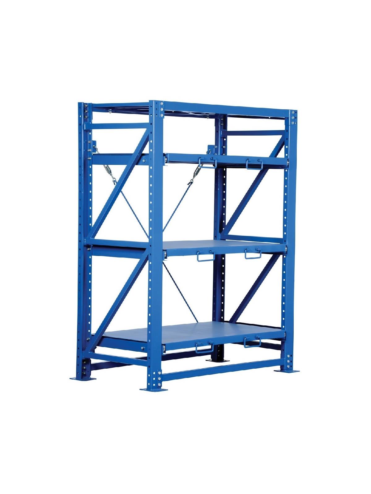 Roll-out shelving racks store heavy dies, fixtures, and machinery. Capacity per shelf is 1,500 pounds evenly distributed with a total uniform capacity of 6,000 pounds. Shelves roll out for convenient loading and retrieving. Can be easily loaded and unloaded with a crane, overhead hoist, forklift, or stacker. Individual shelf heights are adjustable on 2-3/8" centers. Features 10 gauge steel shelves that can extend 20", one (1) at a time, and be locked in the extended position for maximum safety. Top shelf is fixed, non-adjustable. Add on units are available. All steel construction with baked-in powder-coated toughness. Ships unassembled. Three (3) shelves per side of the HVRSOR-120. FOB Shipping Point.
