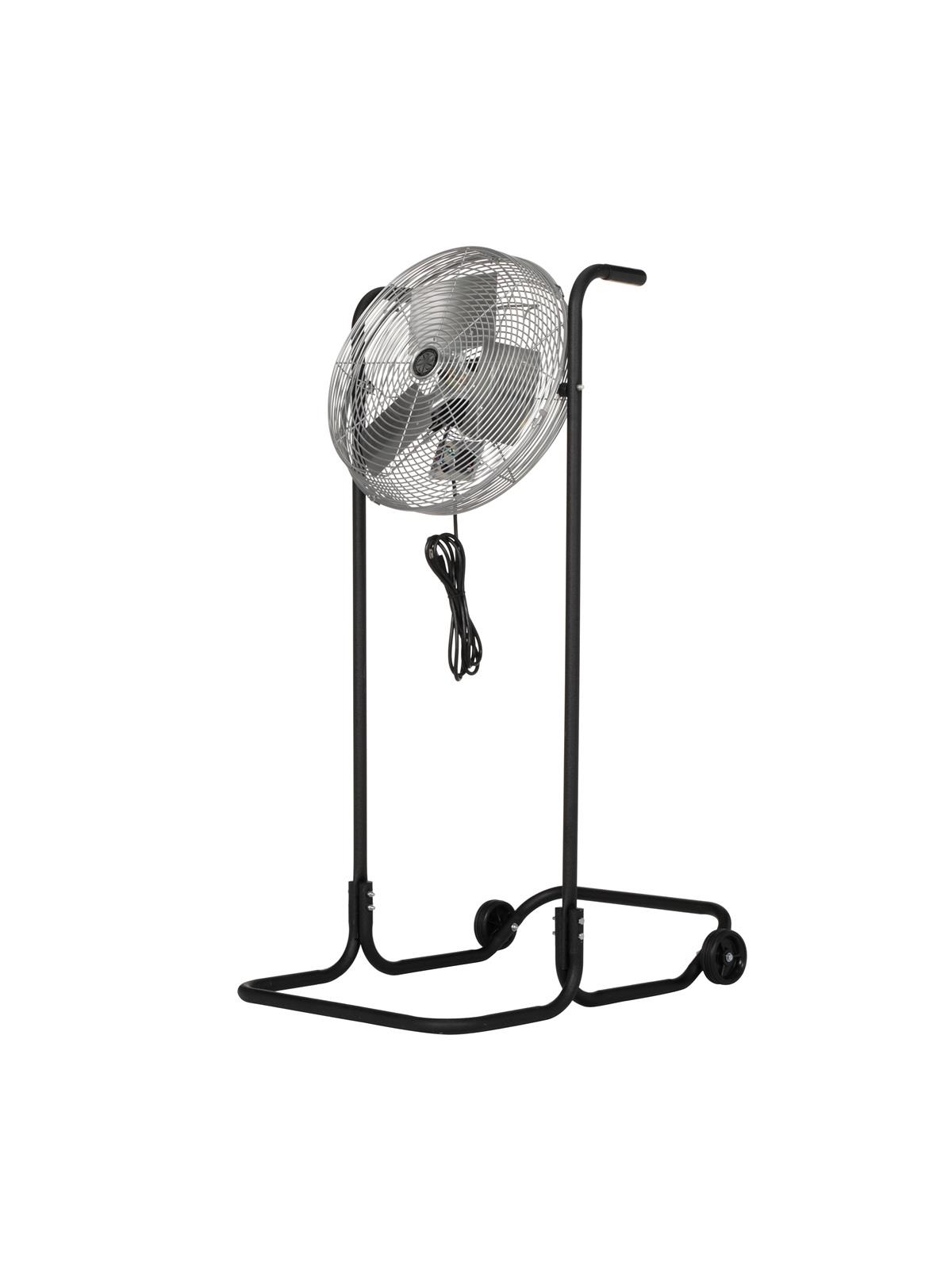 Motor is dependable 3-speed, 1 phase, 115V ball bearing totally enclosed permanently lubricated. Rotary switch. Aluminum blade has a steel hub. Safety guards are double locking chrome plated. Cord is SJT type 3 conductor, 10'L. Rolls on 5" hard rubber wheels. Meets OSHA standards. ETL C/US listed. FOB Shipping Point.