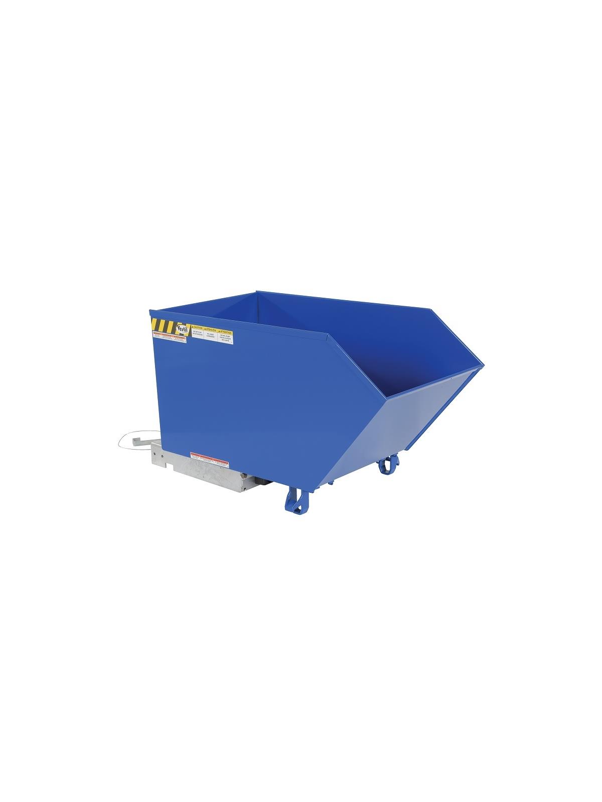 Units feature a full 90 degree dump angle with a cushioned rubber bumper stop. The low profile design is essential for convenient loading. Dumping with a fork truck is quick and simple. A cable is pulled from the seat of the fork truck to dump the hopper. The unit returns to an upright and locked position when lowered to the ground. The included safety restraint/chain must be securely attached to the lift truck without slack. 22" L usable fork pockets measure 7" W x 2"H. Formed base thickness is 1/4". Blue baked-in powder-coated toughness with a galvanized base. Other colors available-contact factory. Models H-25 may be stacked with H-50 models, while the H-100 can be stacked with the H-150 models. The H-200 hoppers can only be stacked with other H-200 series models. Must be attached to fork truck when dumping. FOB Shipping Point.