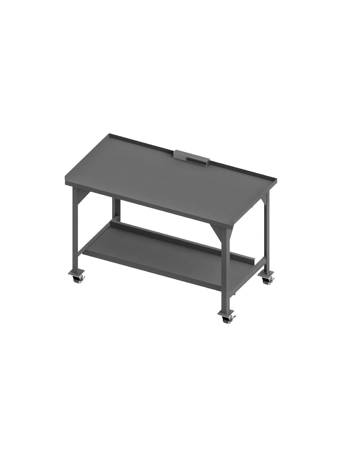 Workbench top is 12 gauge thick reinforced steel. Has angle iron stiffener under work surface and 2" x 2" x 1/4" angle iron legs. Mobile units (DWBM) include (4) 3" phenolic, locking swivel casters. Back and end stops. All units have provisions for optional drawer to be added. Work surfaces are 34" above the floor. All models include a 12 gauge steel lower shelf with 500 lbs. capacity. Foot pads with predrilled holes allow for lagging to the floor. FOB Shipping Point.