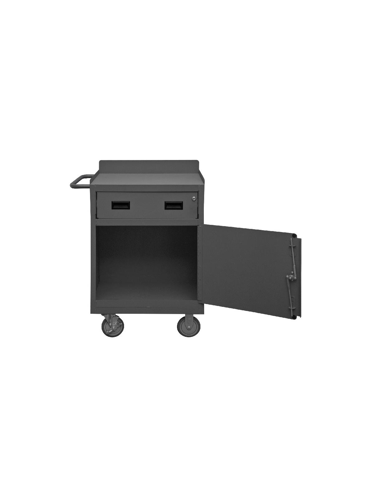 Unit features back and end stops on the work surface. Bolt-on 5 x 1-1/4" polyurethane casters, 2 swivel and 2 rigid with side brakes. Cabinet compartment comes equipped with one adjustable shelf and a keyed handle with 3 point locking system. Models with -TH in the part number include a work surface with 1/4" thick tempered hardboard. Drawers measure 20-7/16" W x 14-11/16" D x 5-7/8" H. Ships fully assembled and ready to use. FOB Shipping Point.