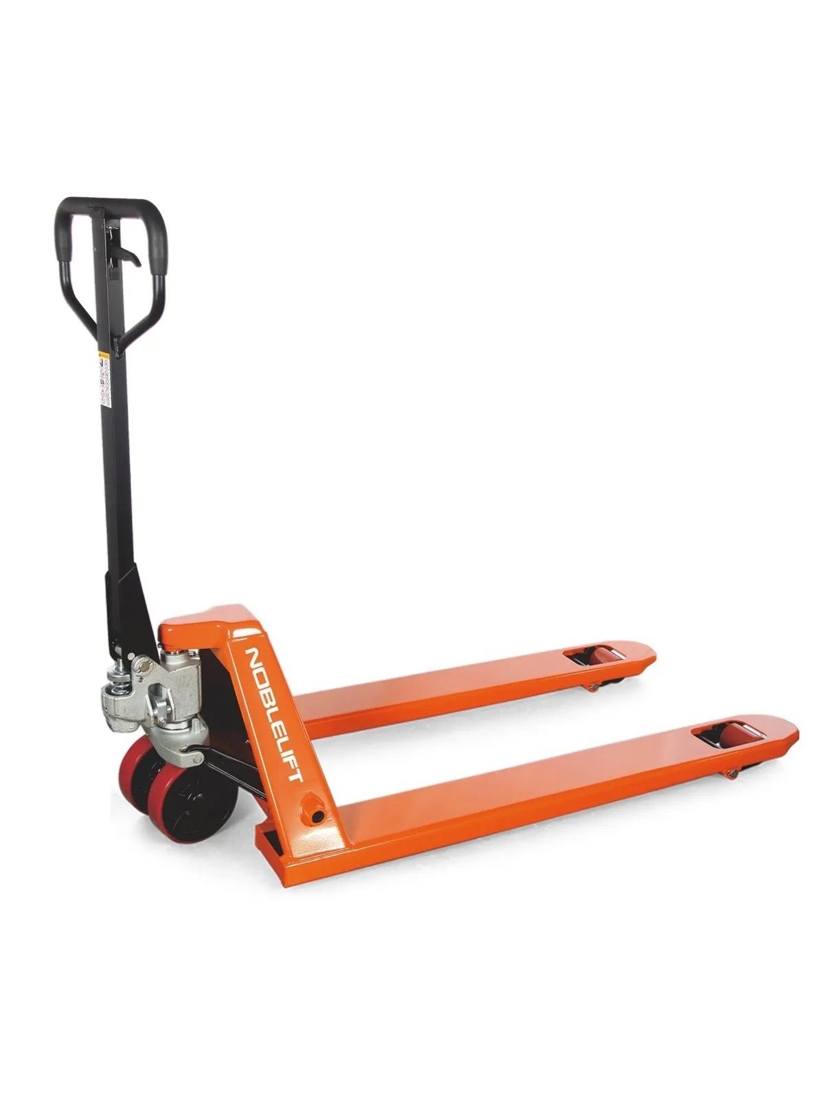 Great quality truck for manual transporting of goods in stores, warehouses, and factory plants. Reliable, sturdy and torsion-resistant due to its extremely strong high quality steel profile. German WAGNER paint system ensures best powder coating and painting quality. All pivot points are greased for excellent maneuverability and effortless steering. Chromed bearing bushes and joints ensure quiet running application and long service life. Galvanized, whole casting hydraulic pump, robust and durable. Great control of lower speed, overload valve and low maintenance. FOB Shipping Point.