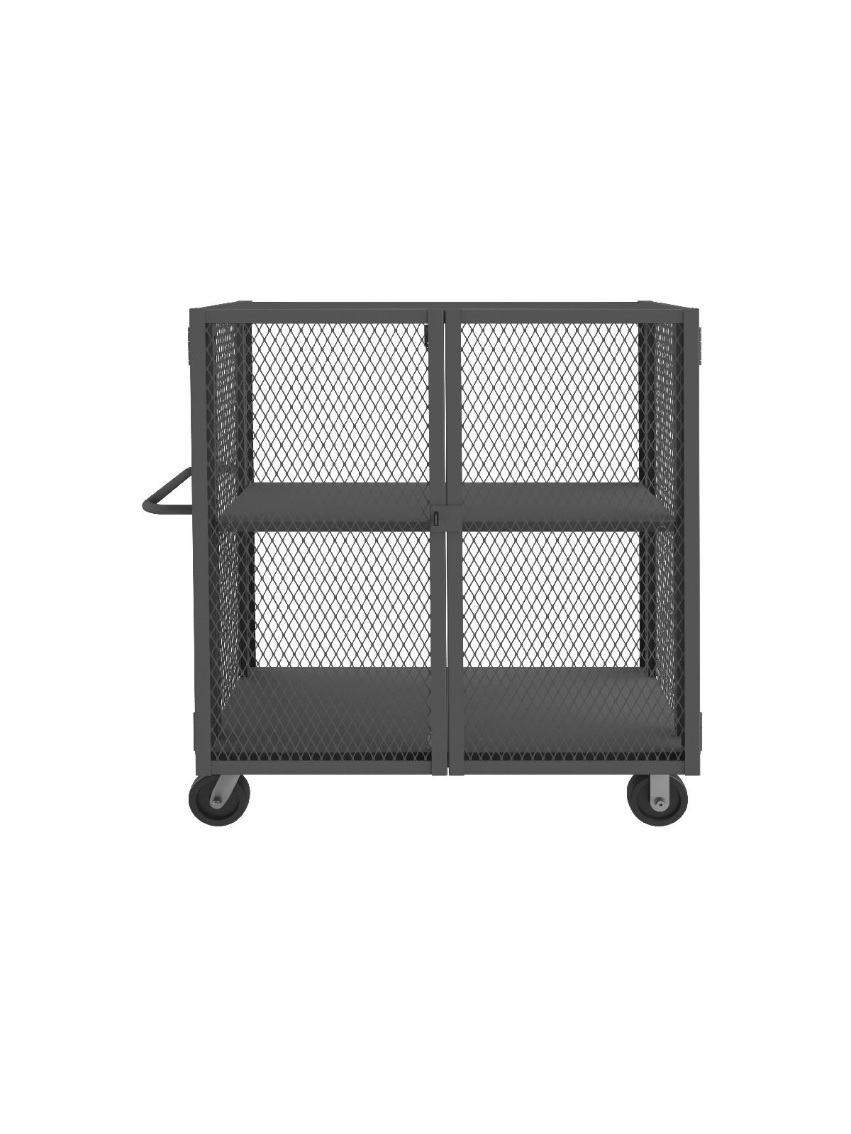 14 gauge steel construction. Punched diamond pattern on sides and front. Interior storage area is 48"H. 3-point handle has provisions for pad-lock (pad-lock not included). Rolls on 6" x 2" phenolic bolt-on casters, (2) swivel, and (2) rigid. Durable, textured gray powder coat finish. Includes one adjustable shelf. FOB Shipping Point. Steel surcharges may apply. See Related Items tab for Optional Shelves for Three Sided and Security Trucks.