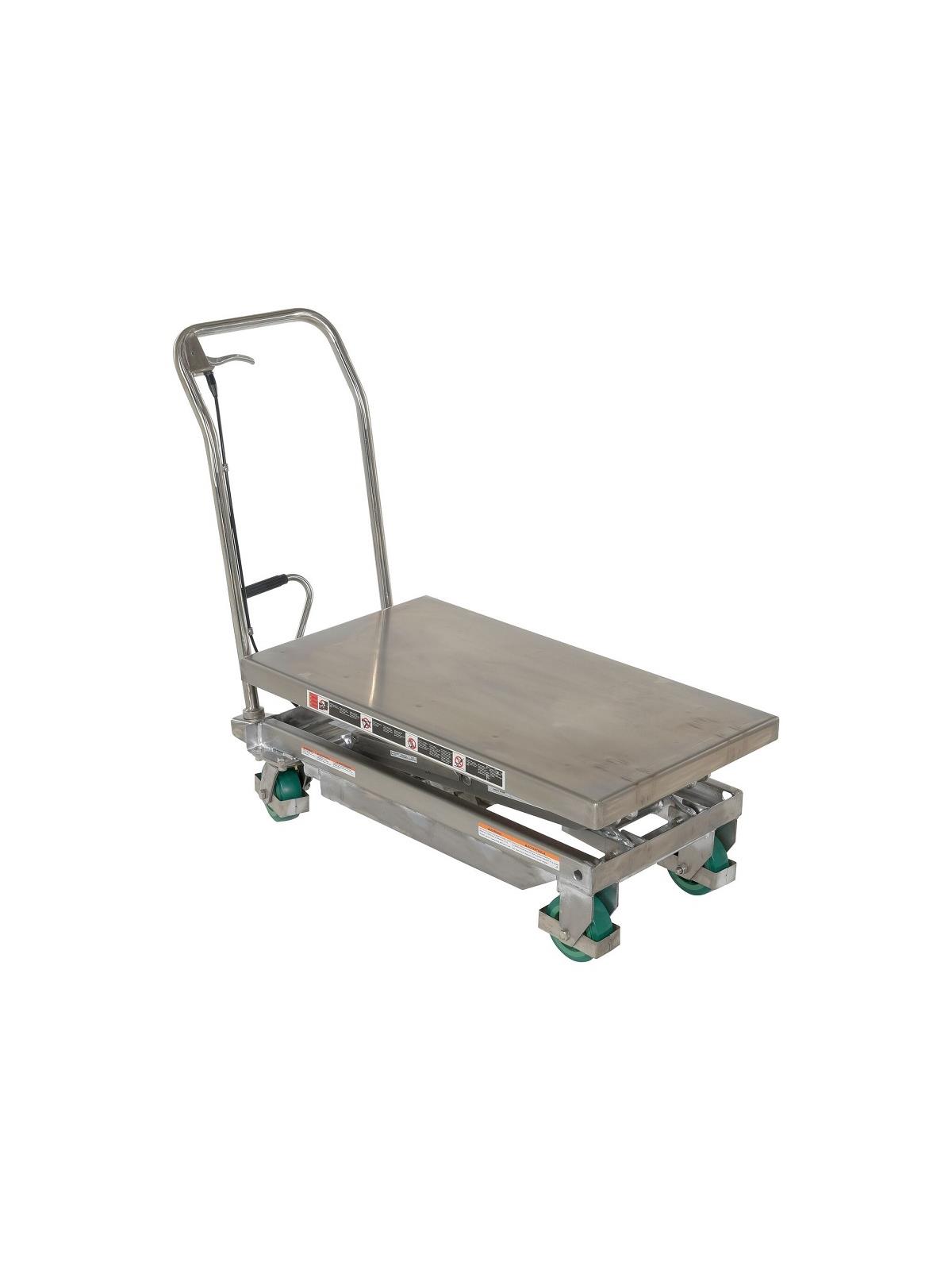 Our fully welded Stainless Steel Carts resist corrosion and wet environments. All parts are made from 304 or 316 grade stainless steel, including the hydraulic pump and foot pedal. These carts are suitable for most food, medical, and pharmaceutical industry settings. Also suitable for wash-down applications. 2 rigid and 2 swivel polyurethane wheels with brakes standard. Units feature a high quality actuated, single-speed hydraulic pump. FOB Shipping Point.