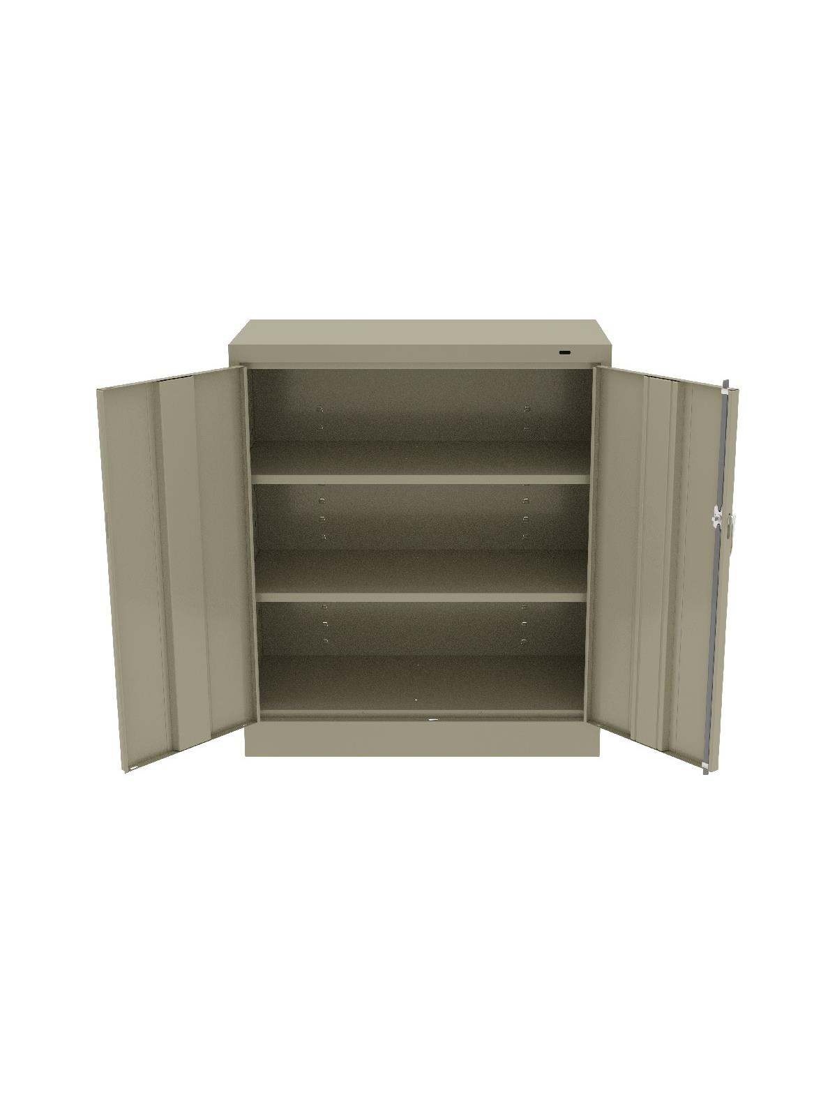 Shelves adjust in 2" increments. Heavy-steel construction with leaf hinges and reinforced doors stand up to a lifetime of heavy use. Handle on right-hand door activates the three-point locking system to keep belongings secure. Raised base keeps contents from contacting moisture from the floor. Available in Black, Champagne/Putty (shown), Sand, Light Gray and Medium Gray (shown). FOB Shipping Point. Surcharge may apply. See Related Items tab for extra shelves.
