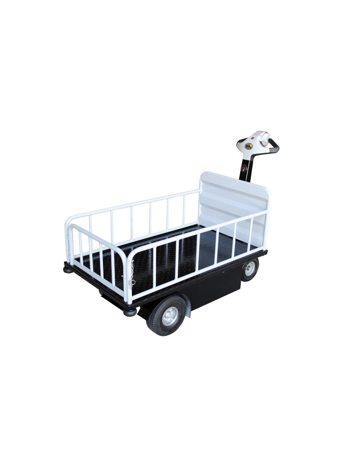 Unique carts feature built-in traction-drive system for easy transportability. Ideal for applications including mail rooms, hospitals, supermarkets, hotels and warehouses. Features 450W electric drive motor with two 12V batteries for power. 110V AC internal battery charger is included along with battery level indicator. Variable throttle speed control for precise maneuvering and positioning is located in the handle. Units roll smoothly on (2) 9" x 3-1/4" solid foam rubber steering wheels and (2) 10" x 3-1/4" solid foam drive wheels. Walking speed is 0-2.8 mph when unloaded and 0-1.5 mph when loaded. Speed control is conveniently located in handle. Handle pivots back towards operator and includes horn and emergency stop. Maximum incline is 7 degrees. Each shelf includes a tread plate surface. Deck height 14". FOB Shipping Point. Due to tariffs and market conditions, pricing subject to change.