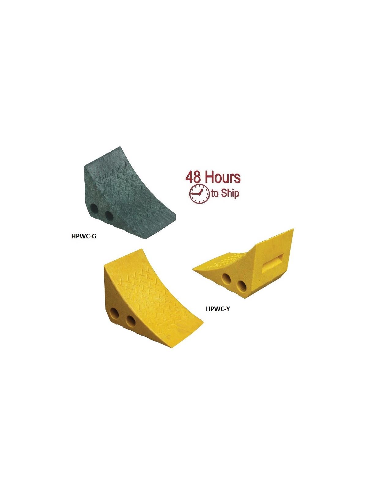 These plastic wheel chocks are durable yet light enough to take along when you travel. Made of 100% recycled plastic. Resistant to damage from sunlight, oil, salt and chemicals. FOB Shipping Point. Series HPWC, features a molded-in handle with two (2) 1-3/8" thru holes. Holes will accommodate HOH-15 chain attachment (see Related Items tab) not included. Series HPWC-DS, features a dual slope. One side has a 45° slope while the other side has a 60° slope. Features a 1-1/8" thru hole to accommodate chain attachment. Due to tariffs and market conditions, pricing subject to change. See Related Items tab for Wheel Chock Accessories.